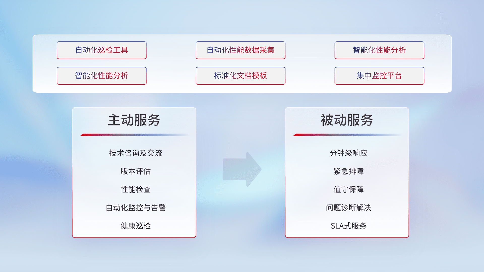 智能化工具和标准化文档,,,,保障服务质量,,,,提供主动服务(包含技术咨询、、、版本评估、、、性能检查、、、、自动化监控与告警、、、健康巡检)和被动服务包含(分钟级响应、、紧急排障、、值守保障、、、问题诊断解决、、、、SLA服务)。。。。